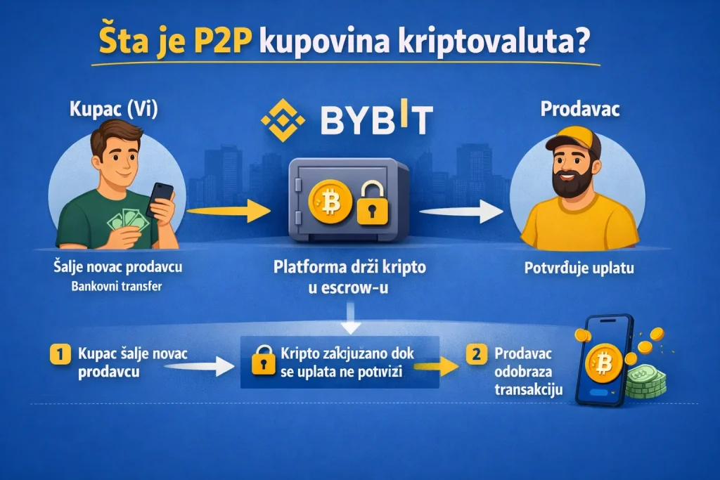 To u praksi znači da kriptovalutu ne kupujete direktno od mjenjačnice, nego od drugog korisnika, dok platforma kao što su Binance ili Bybit samo posreduje i štiti obje strane. Kada otvorite P2P oglas, vi pošaljete novac prodavcu na dogovoreni način, na primjer bankovnim transferom, a platforma drži kripto zaključan u escrow sistemu dok prodavac ne potvrdi uplatu. Tek tada vam kripto bude oslobođen na račun.