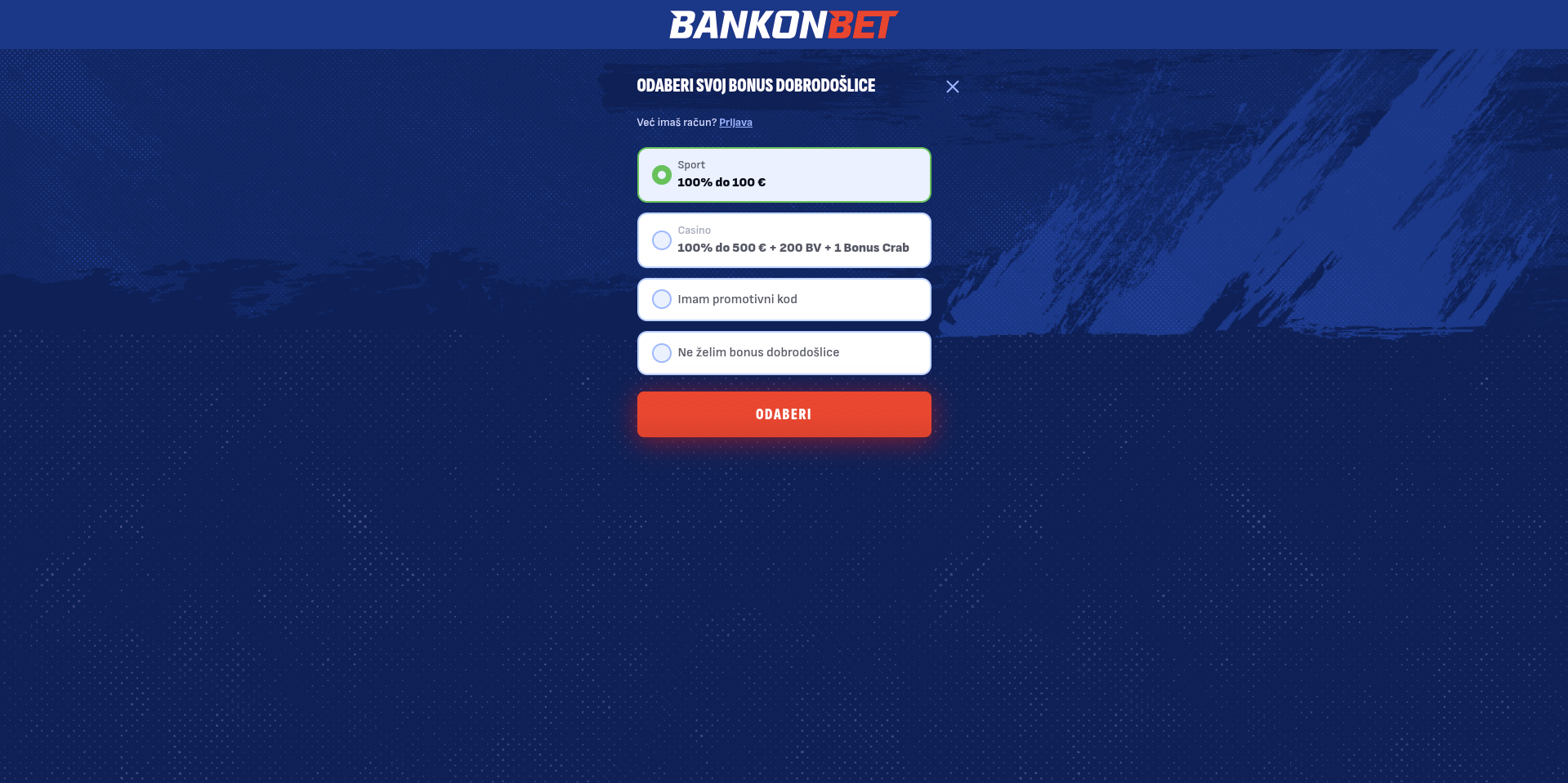 Dok sam prolazio kroz formu, vidio sam i da u jednom koraku traže da odabereš welcome bonus (to se pojavljuje u samom procesu registracije kao izbor – tipično sports/casino). To mi je zapravo korisno jer odmah znaš šta “aktiviraš” prije prve uplate, umjesto da kasnije tražiš po promocijama.