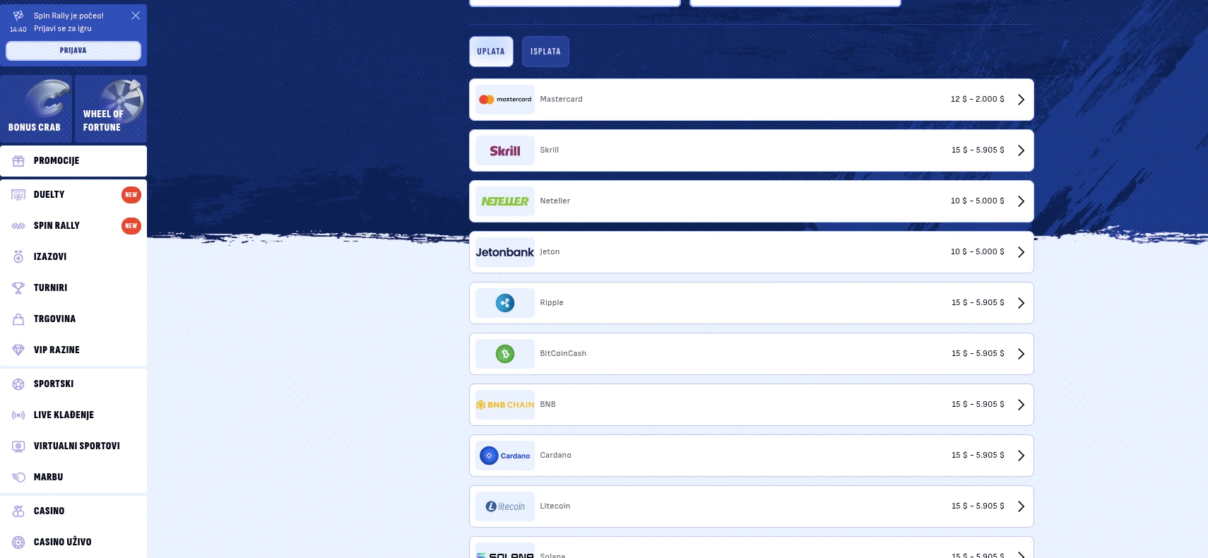 Bukvalno sam prvo otvorio njihovu stranicu Promotions da vidim šta nude “na papiru”, prije nego što uopšte razmišljam o uplati. Na toj stranici mi je odmah iskočila lista najvažnijih kampanja, podijeljena na Sports i Casino: sportski First Deposit Bonus 100% do €100, sportski Weekly Reload 50% do €500, Cashback 10% do €500, plus promo mehanike tipa Accumulator Boost (do 100%), 2 Goals Ahead (Early Payout), Bore Draw (100% refund), Boosted odds, i Bet Builder risk-free.