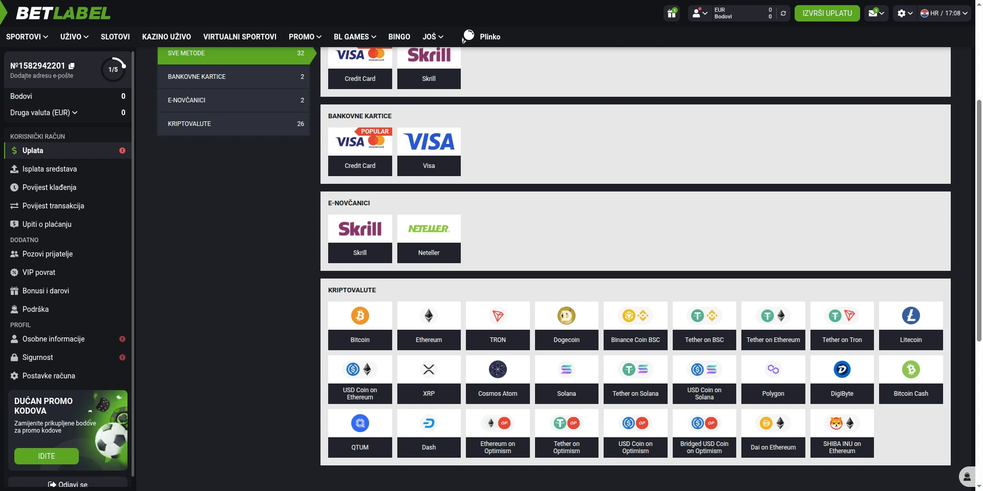 Kriptovalute: BetLabel ima jak crypto dio i često se tu pojavi najveći izbor. Ovo je obično brzo, ali zavisi od mreže i potvrda  nekad je za par minuta, nekad čekaš duže ako je gužva ili fee nizak.Podržane kriptovalute na BetLabelu: BTC, ETH, USDT, LTC, BCH, DOGE, DASH, TRX, XRP.itd splata: kad BetLabel odobri isplatu, kripto transfer nakon slanja obično dođe u rasponu 10–60 minuta