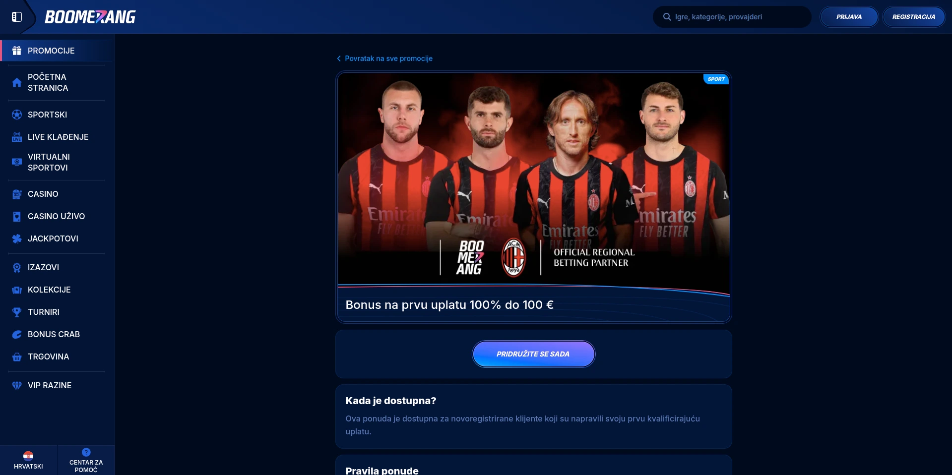 Boomerang ima promocije koje su stvarno zanimljive za čitaoca (tipa early payout mehanike), ali ja bih to uvijek pisao pošteno: promo je dobar samo ako su uslovi fer i jasni. Kod njih sam generalno vidio da pravila znaju biti detaljna što je ok ali to znači da trebaš čitati sitna slova jer lako upadneš u “ovo se ne računa”, “ovo ne važi”, “ovo je samo pre-match” i slično.