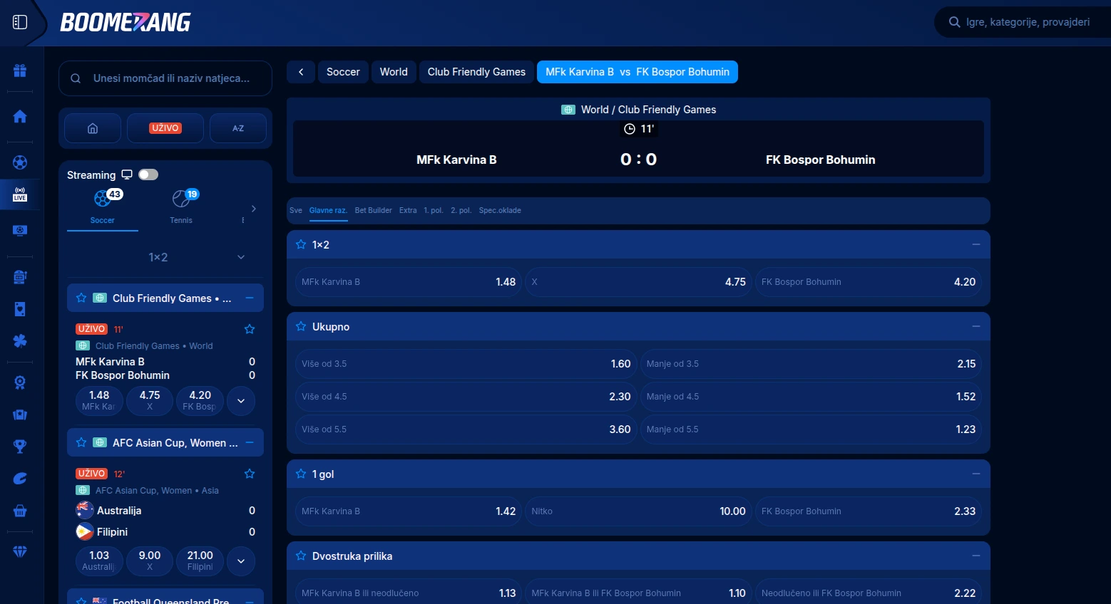 live klađenje je jedna od boljih strana Boomerang.bet po pitanju UX-a: brzo snalaženje, solidna statistika i logičan listić. S druge strane, ako si tip koji klikće jako brzo i očekuje “bez ikakvog re-quote-a”, tu se možeš iznervirati (kao i na svakoj live platformi), a streaming bih tretirao kao bonus, ne kao osnovnu funkciju.
