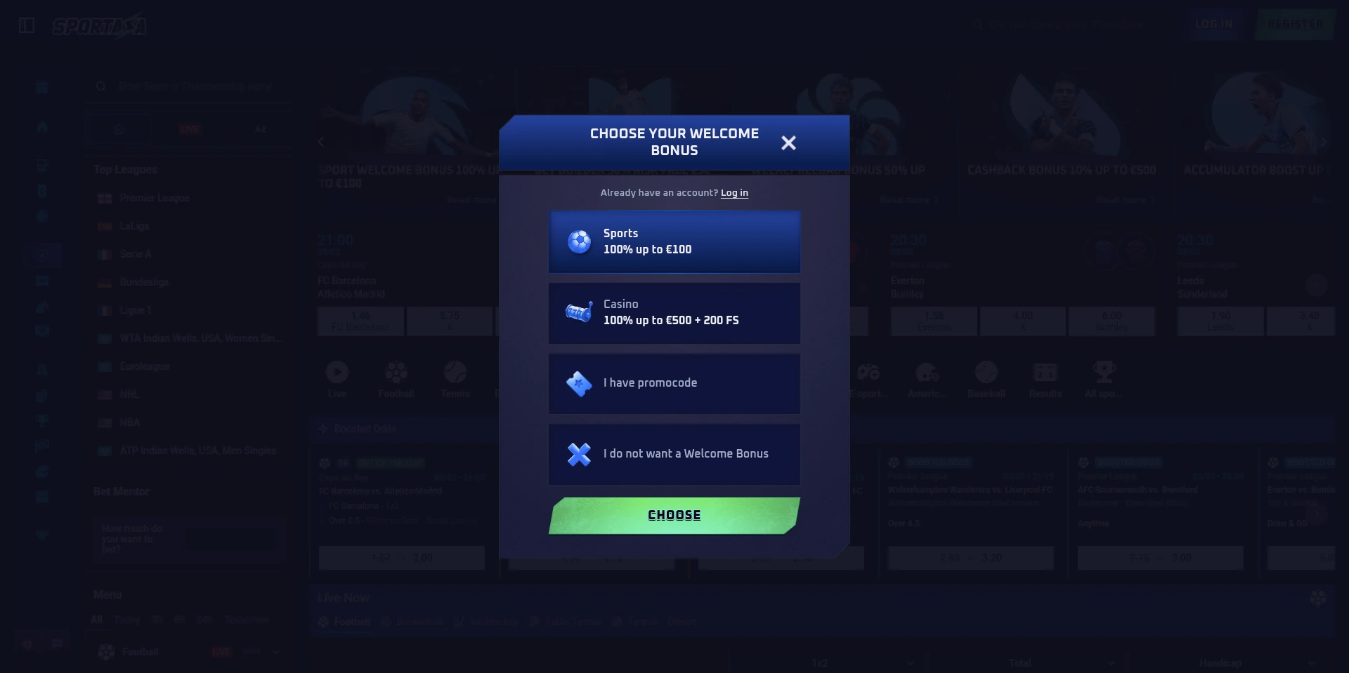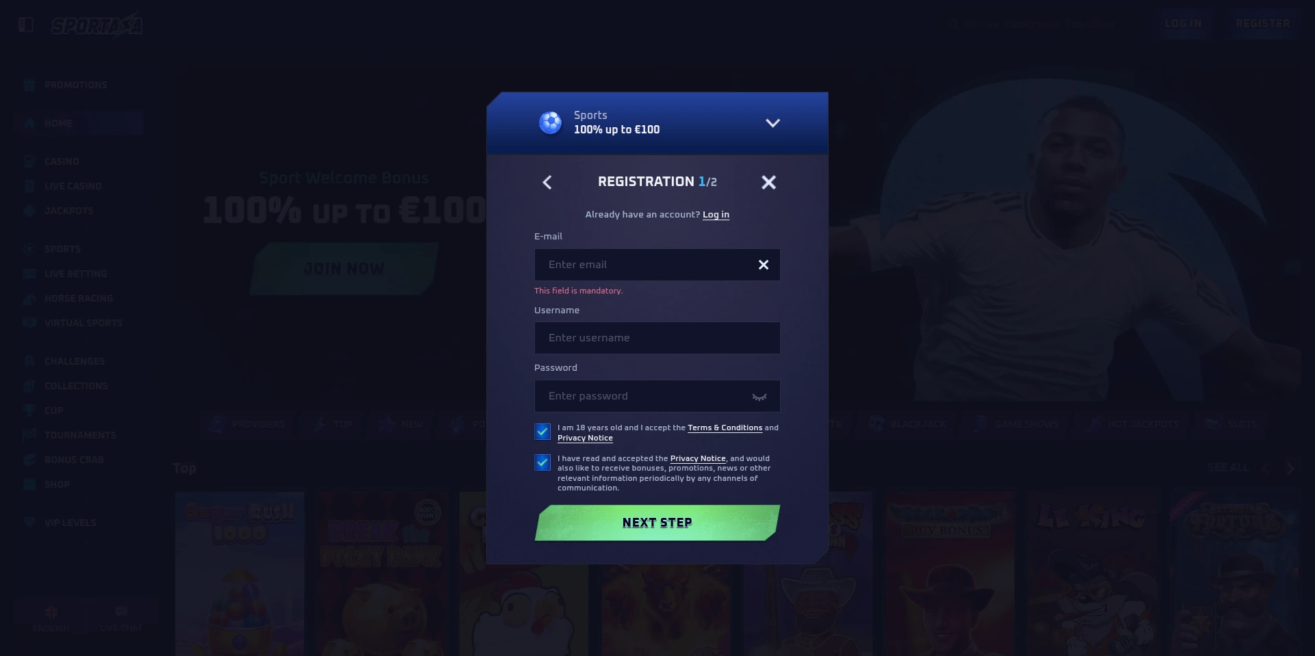 Sportaza nudi jednostavan i intuitivan proces registracije za nove korisnike. Za početak, potrebno je odabrati željeni bonus,bilo za sportsko klađenje, kazino, ili da odlučite da ne želite bonus. Zatim, morate uneti svoju email adresu, korisničko ime, lozinku, i ako imate promo kod, možete ga uneti u ovom koraku. U sledećem koraku, biće potrebno da unesete lične podatke kao što su ime, zemlja, valuta, broj telefona, adresa i datum rođenja.